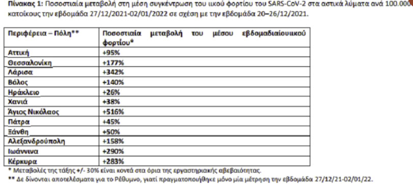 Ανακοινώνονται τα αποτελέσματα των εργαστηριακών ελέγχων του Εθνικού Δικτύου Επιδημιολογίας Λυμάτων για την επιδημιολογική επιτήρηση του ιού SARS-CoV-2 σε αστικά λύματα, το οποίο λειτουργεί υπό το συντονισμό του ΕΟΔΥ. Τα αποτελέσματα αφορούν την περίοδο από 5 έως 11 Απριλίου 2021. Τα δείγματα προέρχονται από την Περιφέρεια Αττικής και τις πόλεις της Θεσσαλονίκης, της Λάρισας, του Βόλου, του Ηρακλείου, των Χανίων, του Ρεθύμνου, του Αγίου Νικολάου Λασιθίου, της Πάτρας, της Ξάνθης και της Αλεξανδρούπολης. Τα δείγματα λαμβάνονται από τις εισόδους των εκάστοτε Μονάδων Επεξεργασίας Λυμάτων και αντιστοιχούν στον πληθυσμό που εξυπηρετείται από αυτές. Πίνακας 1: Ποσοστιαία μεταβολή στη μέση εβδομαδιαία συγκέντρωση του ιικού φορτίου του SARS-CoV-2 στα αστικά λύματα ανά 100.000 κατοίκους την εβδομάδα 5 – 11 Απριλίου 2021 σε σχέση με την εβδομάδα 29 Μαρτίου – 4 Απριλίου 2021.