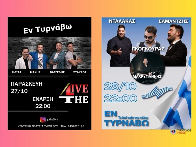 Δυνατό διήμερο στον Τύρναβο με καλή μουσική και πολύ χορό. Παρασκευή 27 Οκτωβρίου και Σάββατο 28 Οκτωβρίου οι δρόμοι οδηγούν στο Εν Τυρνάβω Την Παρασκευή 27 Οκτωβρίου έρχονται οι 4 LIVE MUSIC. Μάκης Καψάλης, Βαγγέλης Καψάλης, Ηλίας Παζαρας και…
