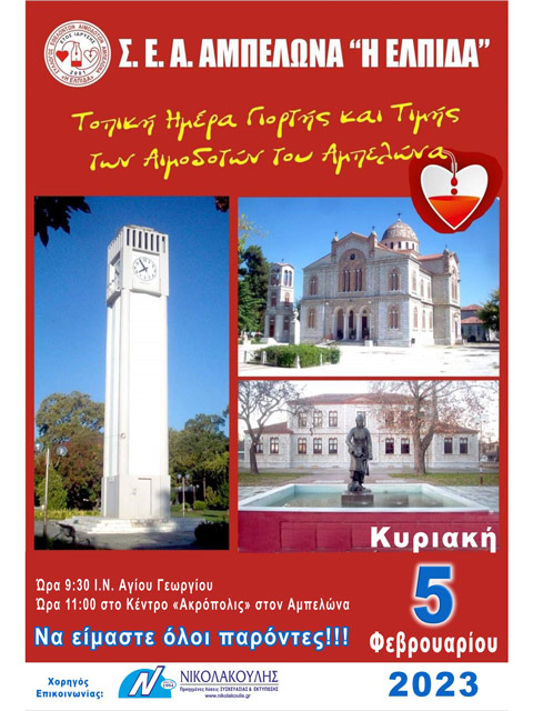 Την τοπική ημέρα Γιορτής και Τιμής των Εθελοντών Αιμοδοτών του Αμπελώνα θα τιμήσει και φέτος με μια λιτή και σεμνή εκδήλωση, την Κυριακή 05 Φεβρουαρίου 2023 ο Σύλλογος Εθελοντών Αιμοδοτών Αμπελώνα «Η ΕΛΠΙΔΑ». Το πρόγραμμα της εκδήλωσης θα περιλαμβάνει:…