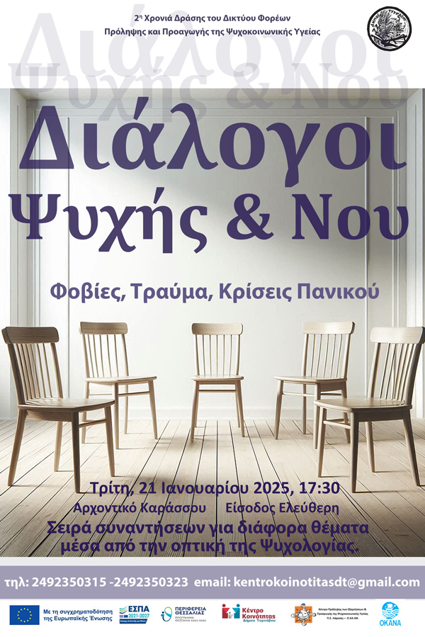 Την Τρίτη, 21 Ιανουαρίου 2025, στις 17:30΄ στο Αρχοντικό Καράσσου, θα πραγματοποιηθεί η τρίτη συνάντηση των Διαλόγων Ψυχής & Νου με θέμα: «Φοβίες, Τραύμα, Κρίσεις Πανικού». Στη συνάντηση οι συμμετέχοντες θα εξοικειωθούν με τις έννοιες, την διαχείριση των δυσκολιών τους,…