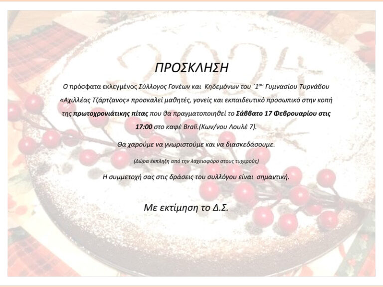 Ο πρόσφατα εκλεγμένος σύλλογος Γονέων και Κηδεμόνων του 1ου Γυμνασίου Τυρνάβου Αχιλλέας Τζάρτζανος, προσκαλεί μαθητές, γονείς και εκπαιδευτικό προσωπικό στην κοπή της Πρωτοχρονιάτικης πίτας που θα πραγματοποιηθεί το Σάββατο 17 Φεβρουαρίου 2024 στις 17:00 στο καφέ Brali (Κων/νου Λουλέ 7).…