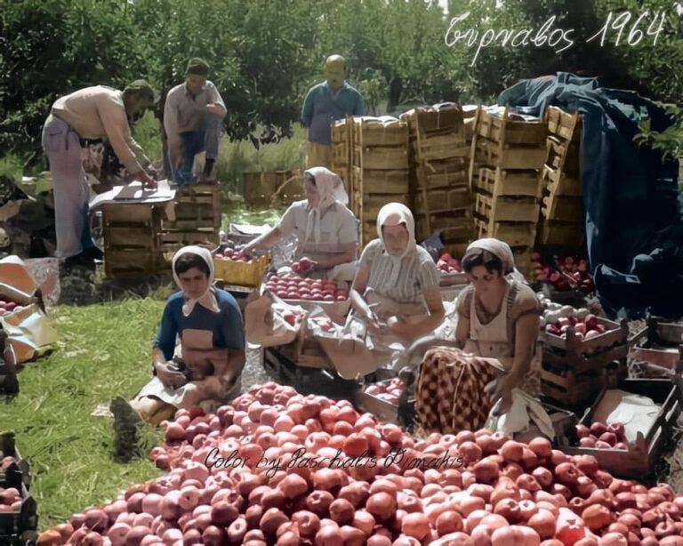 Η μαγεία του να ζωντανεύει μια φωτογραφία ασπρόμαυρη μισού αιώνα+ Τυρναβος 1964 Διαλογή μήλων και τοποθέτηση τους σε ξύλινα τελάρα της εποχής… Στο μέσο εκ των τριών γυναικών άνω η γιαγιά της γυναίκας μου η Κωνσταντίνα Φωτογραφία του μεγάλου Τάκη…