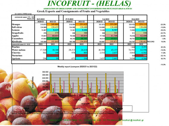 Σύμφωνα με τα ίδια στοιχεία, οι εξαγωγές κερασιών είναι αυξημένες κατά 11,9% φτάνοντας τους 6.542 τόνους και των βερίκοκων κατά 50,7% αγγίζοντας τους 4.566 τόνους.