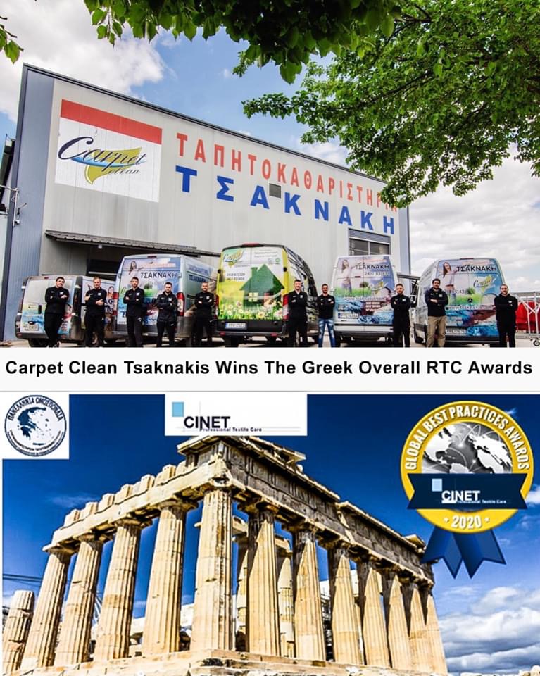 Τα GREEK BEST PRACTICES AWARDS 2020 ( Βραβεία Βέλτιστων Πρακτικών Εταιρειών Καθαρισμού) διοργανώθηκαν στις 3 Σεπτεμβρίου από την Πανελλήνια Ομοσπονδία Στεγνοκαθαριστηρίων-Ταπητοκαθαριστηρίων και τη CINET (Διεθνής Επιτροπή Φροντίδας Κλωστουφαντουργίας) σε μια ζωντανή διαδικτυακή ροή με εξαιρετικό αποτέλεσμα. Η Carpet Clean Τσακνάκη από τη Λάρισα κέρδισε την διαδικτυακή εθνική προεπιλογή και θα εκπροσωπήσει την Ελλάδα στον τελικό των Παγκόσμιων Βραβείων Βέλτιστων πρακτικών που θα μεταδοθεί ζωντανά από το Άμστερνταμ στις 4 και 5 Νοεμβρίου 2020, όπου θα ανταγωνιστεί με τις μεγαλύτερες εταιρίες καθαρισμού από όλο τον Κόσμο.