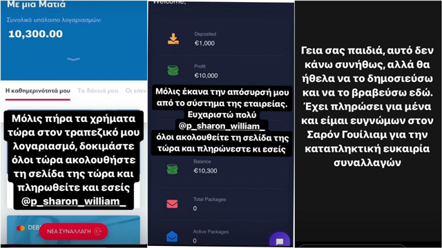 Θύματα και πολλοί Τυρναβίτες οι οποίοι έχασαν τα προφίλ τους από αυτή τη παγίδα. Σημάδι ότι κάτι δεν πάει καλά είναι η συνεχόμενη ανάρτηση ιστοριών στο προφίλ τους που εξηγούν πως κέρδισαν με 1000 ευρώ 10000ευρώ τα οποία άμεσα είχαν στον λογαριασμό τους ενώ είναι και ενθουσιασμένοι με την βοήθεια ενός ανθρώπου από το εξωτερικό.