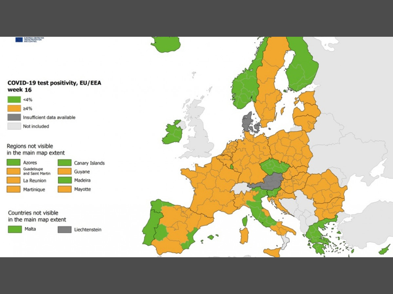 Σύμφωνα με το ECDC «πράσινο» έχουν οι χώρες εάν το ποσοστό ειδοποίησης 14 ημερών είναι χαμηλότερο από 25 περιπτώσεις ανά 100.000 και το ποσοστό θετικότητας δοκιμής κάτω από 4%.