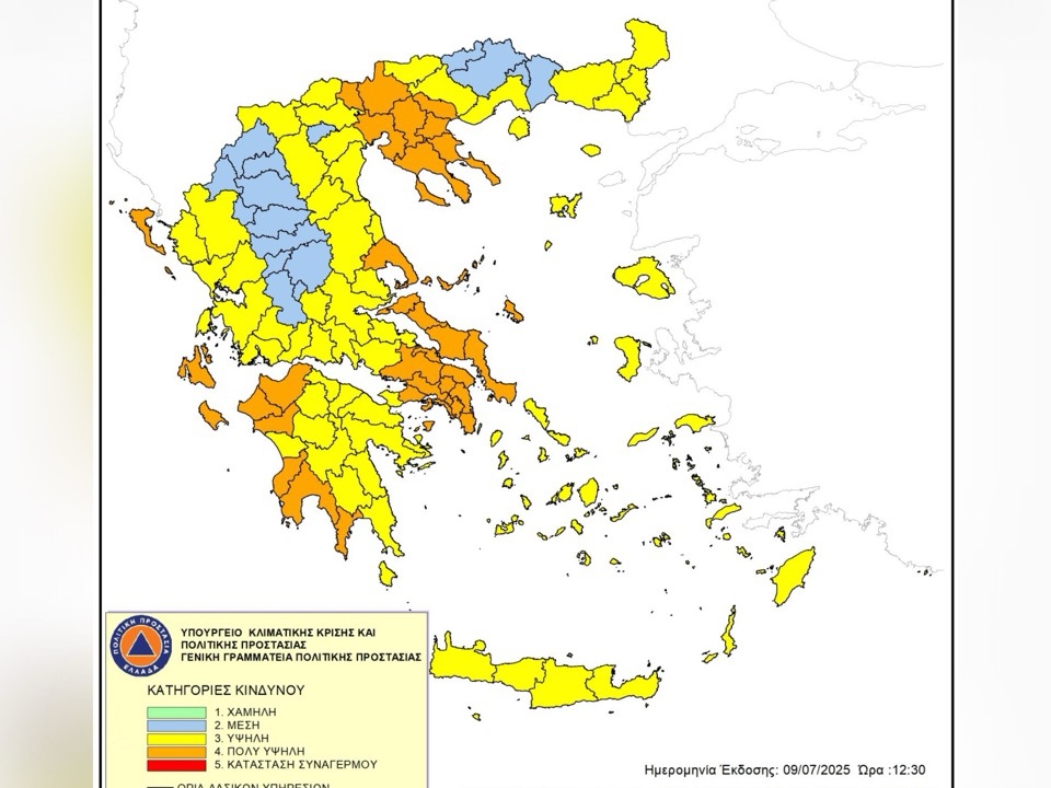 Σε κατάσταση αυξημένης επιφυλακής τίθεται η χώρα ενόψει της Πέμπτης 10 Ιουλίου, σύμφωνα με τον Χάρτη Πρόβλεψης Κινδύνου Πυρκαγιάς που εξέδωσε η Γενική Γραμματεία Πολιτικής Προστασίας.