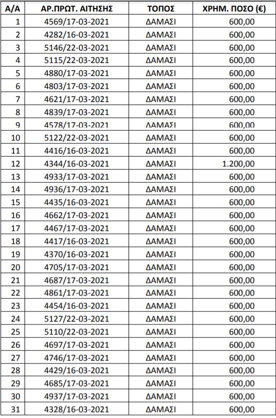 Εγκρίθηκαν από το Δήμαρχο Τυρνάβου κ. Γιάννη Κόκουρα  οι κάτωθι αιτήσεις κατοίκων του Δαμασίου, του Δήμου Τυρνάβου  ως δικαιούχοι της χορήγησης επιδόματος πρώτων βιοτικών αναγκών, των οποίων η κύρια κατοικία έχει πληγεί από τον σεισμό στις 3 Μάρτιου 2021 και έχει περιέλθει σε κατάσταση έκτακτης ανάγκης του άρθρου 1 της ΚΥΑ 33862/06-05-2019 ( ΦΕΚ 1699/Β/16-5-2019).