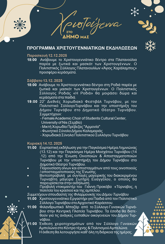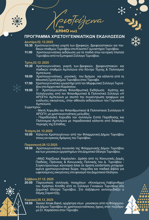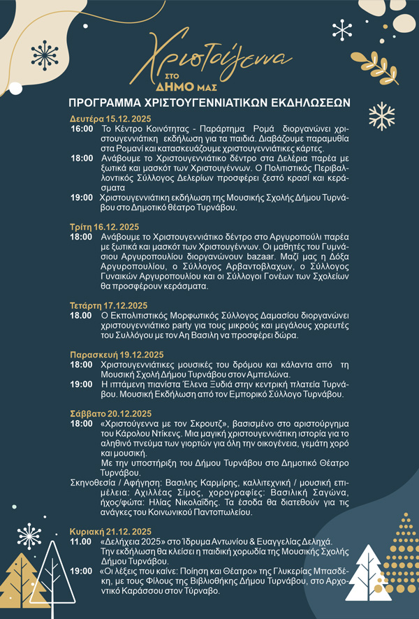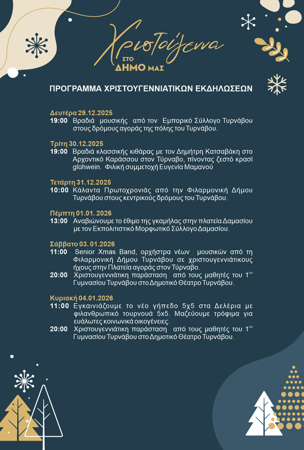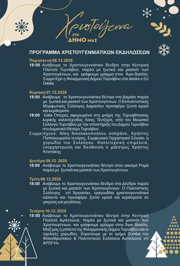 Σε χριστουγεννιάτικη ατμόσφαιρα βρίσκεται ο Δήμος Τυρνάβου, καθώς πλήθος εκδηλώσεων έχουν προγραμματιστεί για να γιορτάσουμε τον ερχομό των Χριστουγέννων και της νέας χρονιάς.