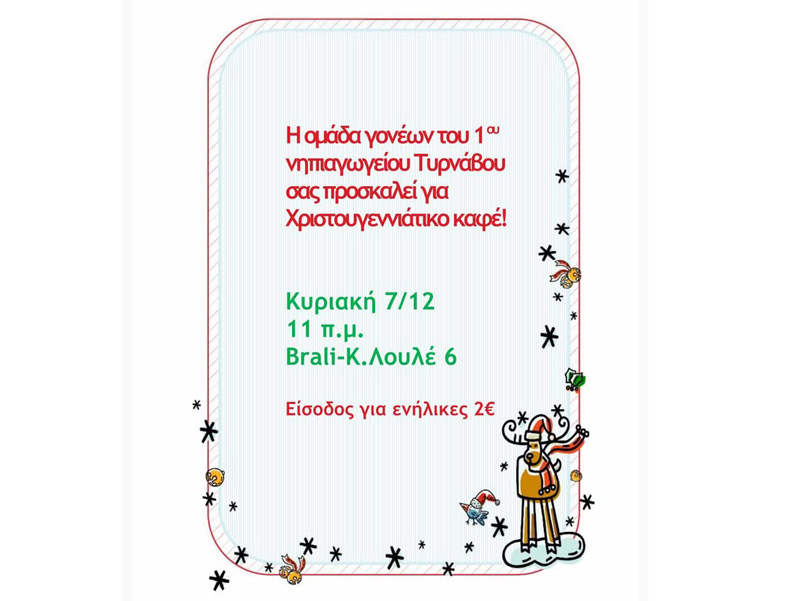 Σε εορταστικό κλίμα μπαίνει το 1ο Νηπιαγωγείο Τυρνάβου, καθώς η ομάδα γονέων διοργανώνει ένα ζεστό και χαρούμενο Χριστουγεννιάτικο καφέ την Κυριακή 7 Δεκεμβρίου, στις 11 το πρωί, στον χώρο Brali – Κ. Λουλέ 6.