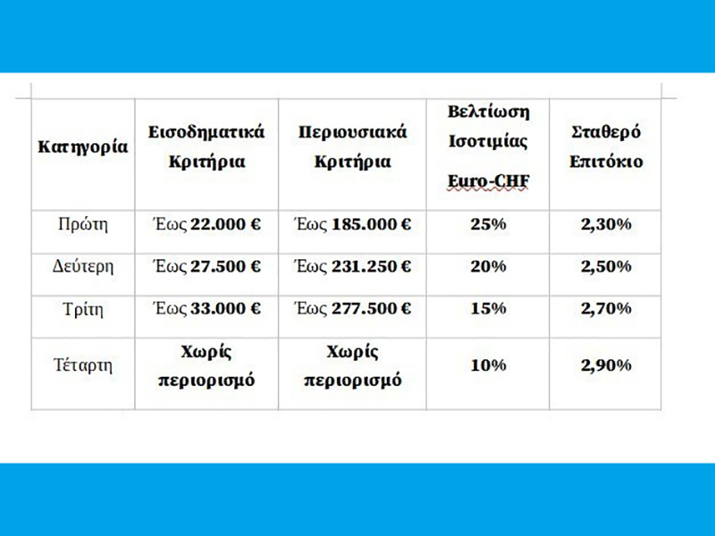 Κριτήρια: Στην κατηγορία αυτήν δεν υπάρχουν εισοδηματικά ή περιουσιακά κριτήρια για τους δανειολήπτες.
