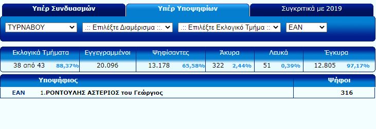 Δείτε αναλυτικά την κατανομή των σταυρών προτίμησης στους υποψήφιους βουλευτές στον δήμο Τυρνάβου 38 από 43 εκλογικά κέντρα δηλαδή 88,37%