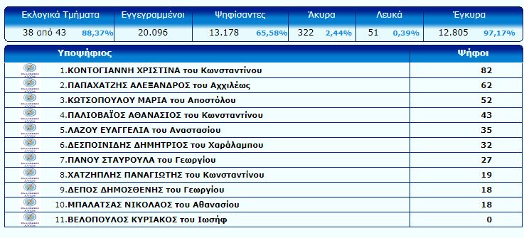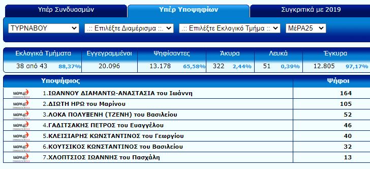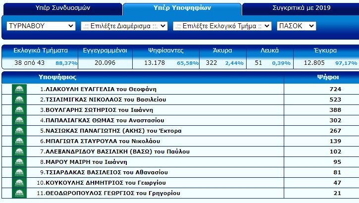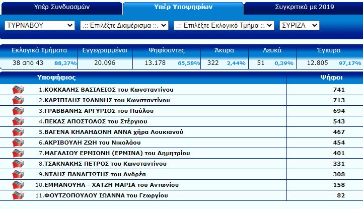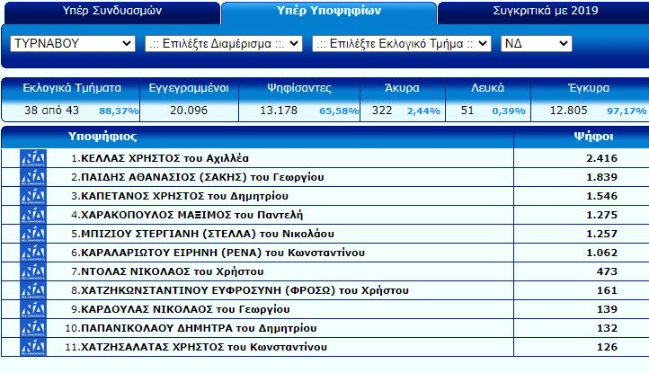Δείτε αναλυτικά την κατανομή των σταυρών προτίμησης στους υποψήφιους βουλευτές στον δήμο Τυρνάβου 38 από 43 εκλογικά κέντρα δηλαδή 88,37%
