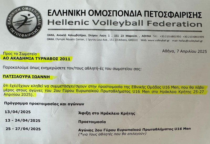 Με ιδιαίτερη χαρά και περηφάνια ανακοινώνουμε τη δεύτερη συνεχόμενη κλήση του αθλητή Πατσιαούρα Ιωάννη, μέλους της ΑΟ Ακαδημία Τυρνάβου, στην Εθνική Ομάδα U16 Ανδρών της Ελλάδας!