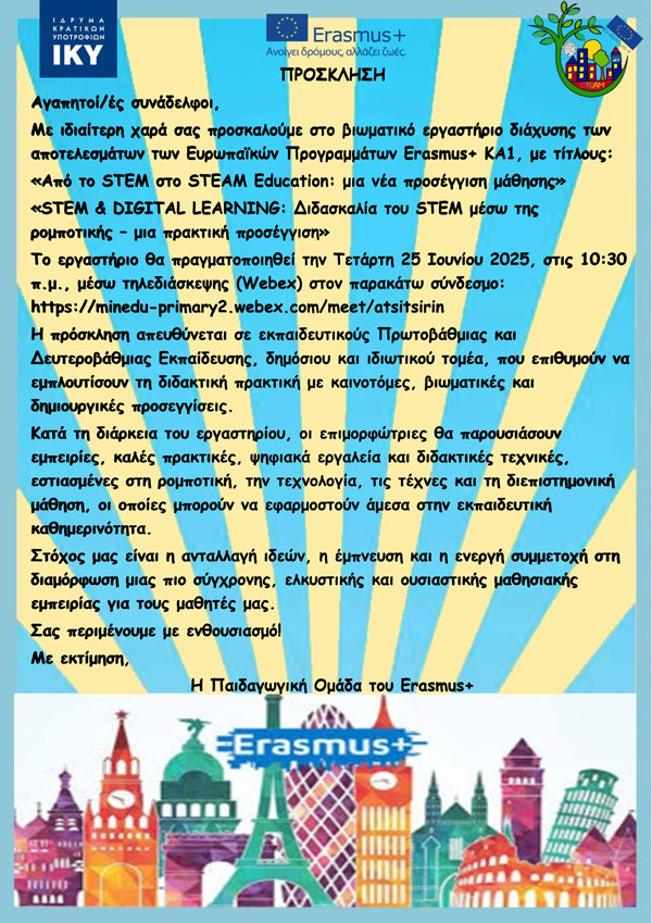 Με μεγάλη χαρά σας προσκαλούμε στη διαδικτυακή εκδήλωση διάχυσης των αποτελεσμάτων των ευρωπαϊκών κινητικοτήτων του προγράμματος Erasmus+ KA1, που υλοποιήθηκαν στη Βαρκελώνη και στο Βέλγιο.