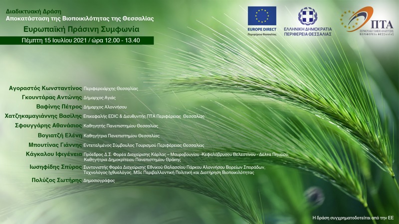 Το Κέντρο Ευρωπαϊκής Πληροφόρησης Europe DirectΠεριφέρειας Θεσσαλίας και το Περιφερειακό Ταμείο Ανάπτυξης (ΠΤΑ) Περιφέρειας Θεσσαλίαςδιοργανώνουν διαδικτυακή δράση με θέμα « Αποκατάσταση της βιοποικιλότητας της Θεσσαλίας – Ευρωπαϊκή Πράσινη Συμφωνία» την Πέμπτη 15 Ιουλίου 2021 και ώρα 12.00-13.40.