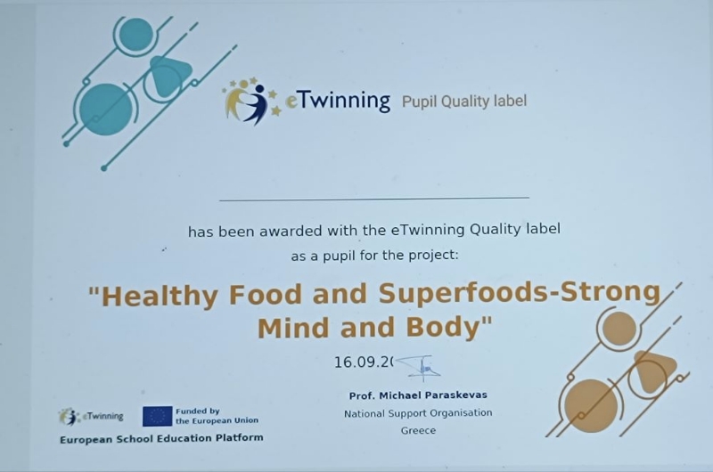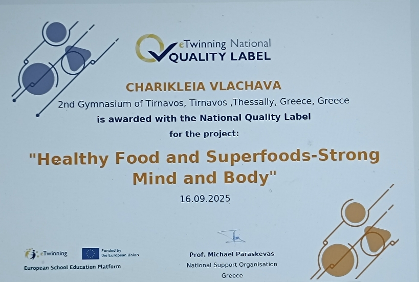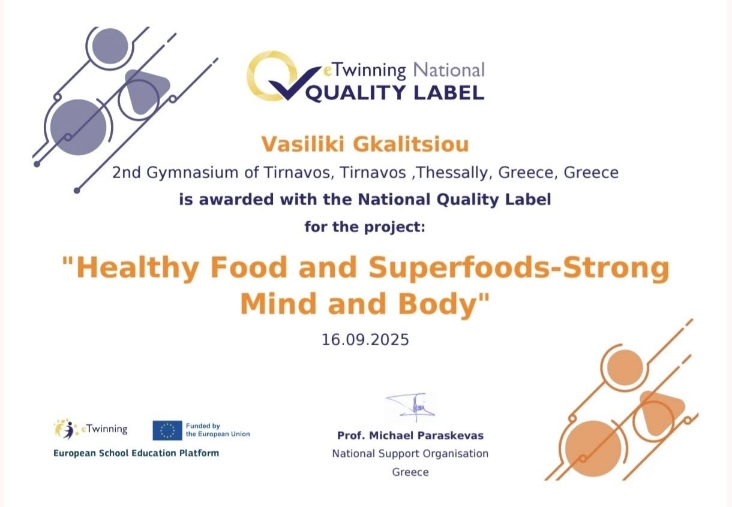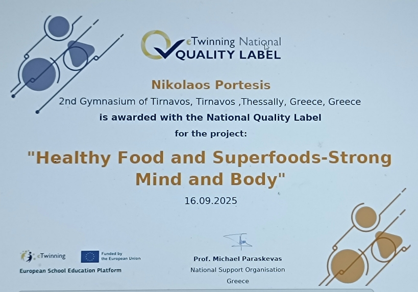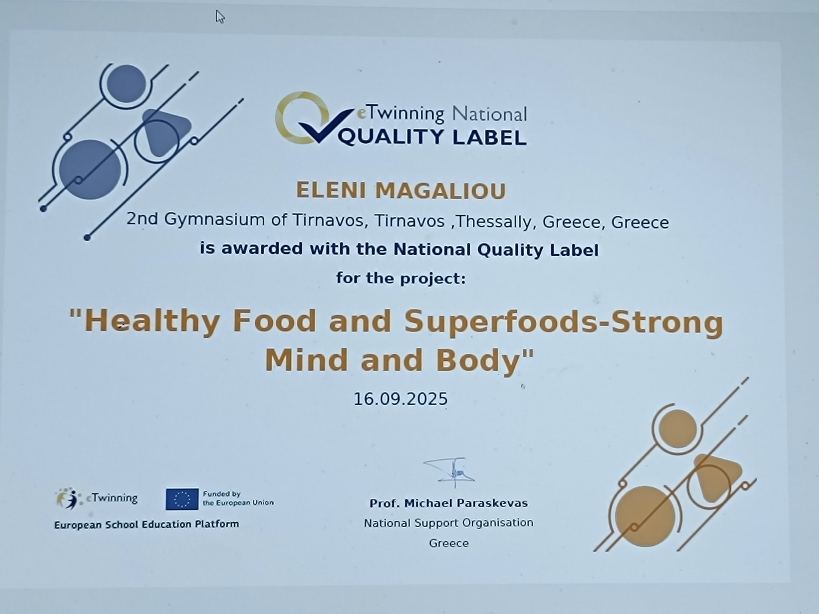 Το eTwinning έργο «Healthy Food and Superfoods – Strong Mind and Body», του 2ου Γυμνασίου Τυρνάβου, διακρίθηκε με την Εθνική Ετικέτα Ποιότητας, αναγνωρίζοντας τη συστηματική δουλειά μαθητών και εκπαιδευτικών, τη δημιουργικότητα, τη συνεργασία και τη δέσμευση για την προώθηση ενός υγιεινού τρόπου ζωής.