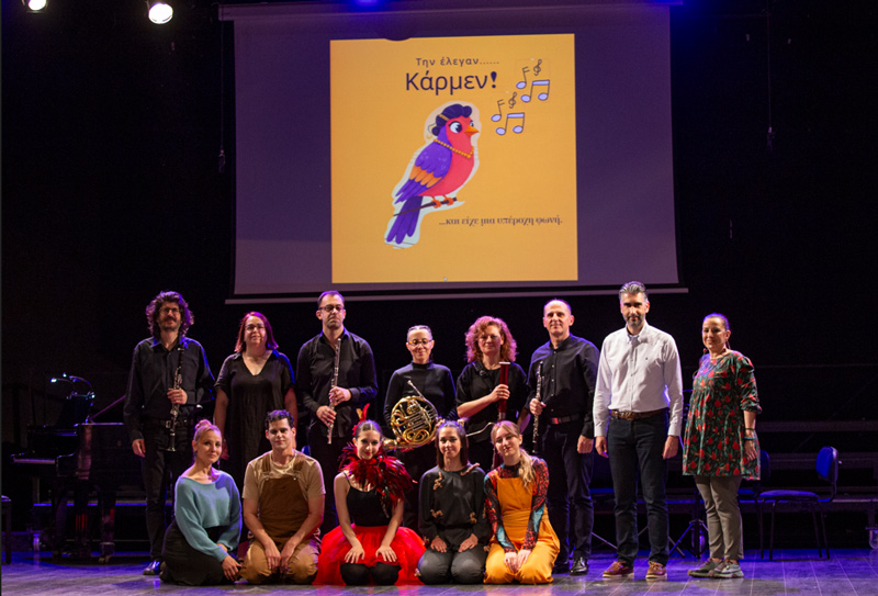 Η ιστορία της Carmen παρουσιάζεται σε κείμενα προσαρμοσμένα για παιδιά, τα οποία εναλλάσσονται με τη μουσική συνοδεία ενός κουιντέτου πνευστών και πιάνου, καθώς και με τη συμμετοχή χορευτικής ομάδας που ζωντανεύει την αφήγηση μέσα από κίνηση και έκφραση.