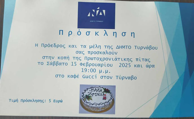 Η Πρόεδρος και τα μέλη της Δημοτικής Τοπικής Οργάνωσης (ΔΗΜ.Τ.Ο.) Τυρνάβου σας προσκαλούν στην ετήσια εκδήλωση κοπής της Πρωτοχρονιάτικης πίτας, που θα πραγματοποιηθεί το Σάββατο 15 Φεβρουαρίου 2025, στις 19:00 μ.μ., στο καφέ Gucci στον Τύρναβο.