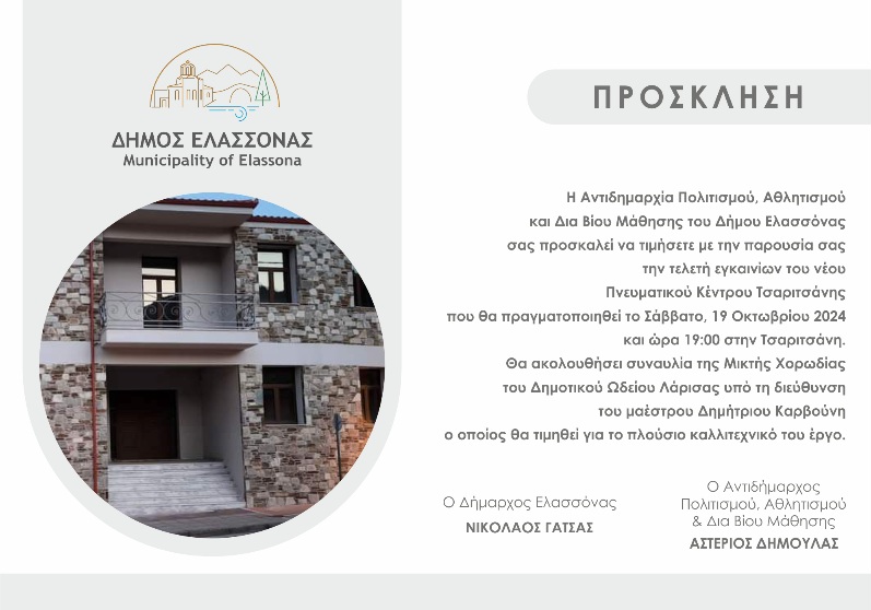 Δήμος Ελασσόνας: «Εγκαίνια του Πνευματικού Κέντρου Τσαριτσάνης το Σάββατο 19 Οκτωβρίου»