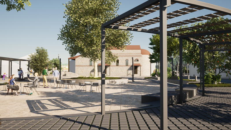 Η αρχιτεκτονική πρόταση συνδυάζει τη σύγχρονη αισθητική των δημόσιων χώρων που εξυπηρετούν τη συνάθροιση του κοινού με την παραδοσιακή αρχιτεκτονική του ναού του Αγίου Γεωργίου, ο οποίος δεσπόζει στο κέντρο του χωριού και καθορίζει την επιλογή των υλικών και των χρωμάτων της νέας πλατείας. Η μελέτη για τη νέα πλατεία υιοθέτησε πλήρως την επιθυμία των κατοίκων να διατηρηθούν τα δέντρα της πλατείας, εστιάζοντας έτσι στην ανάδειξή τους με πλατύτερους δεντροδόχους, ενώ παράλληλα διαμορφώνει νέους χώρους για την ανάπτυξη τραπεζοκαθισμάτων και πάγκων αναψυχής, για πέργκολες και συστήματα φωτιστικών σωμάτων.