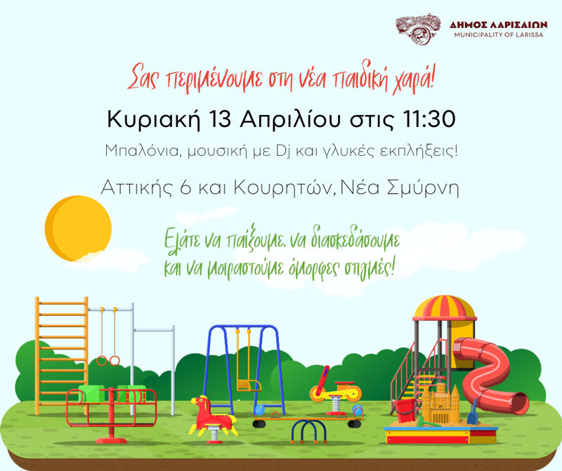 Ειδική εκδήλωση για μικρούς και μεγάλους, με αφορμή τη λειτουργία της νέας Παιδικής Χαράς στη συνοικία της Νέας Σμύρνης, πραγματοποιεί ο Δήμος Λαρισαίων, την Κυριακή, 13 Απριλίου, στις 11.30 π.μ.