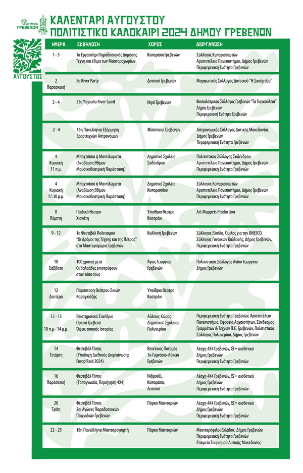 Μουσική, θέατρο, χορός, εκθέσεις, φεστιβάλ, εικαστικά, κινηματογράφος, σεμινάρια γαστρονομίας, συνδυάζονται και εναλλάσσονται αρμονικά και υπόσχονται όμορφες, δροσερές, διασκεδαστικές, δημιουργικές και ανθρώπινες στιγμές σε όλους τους συνδημότες μας, αλλά και στους επισκέπτες που θα βρεθούν στον πανέμορφο και ιστορικό Δήμο Γρεβενών.