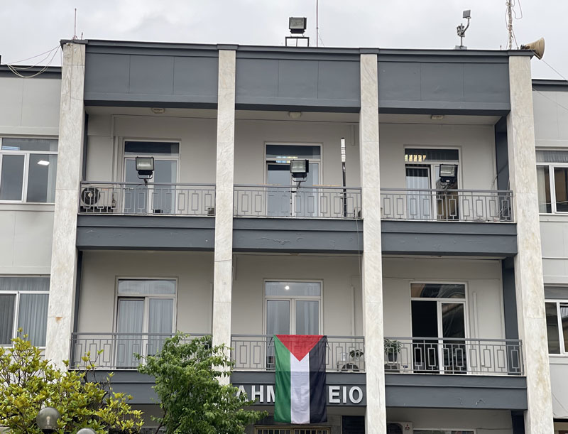 Η Δημοτική Αρχή Τυρνάβου προχώρησε χθες στην ανάρτηση της σημαίας της Παλαιστίνης στο Δημαρχείο Τυρνάβου, τιμώντας της 77η επέτειο της Νάκμπα και εκφράζοντας για μια ακόμη φορά την αλληλεγγύη της στο λαό της Παλαιστίνης και στον αγώνα του.