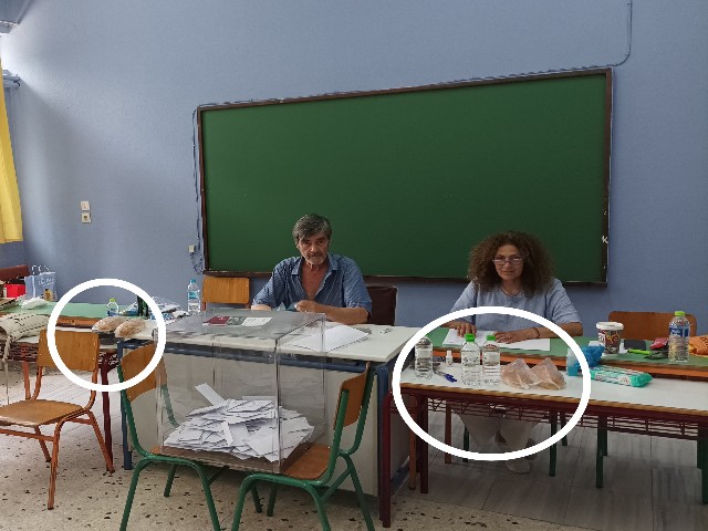 Χαρακτηριστική είναι η φωτογραφία από εκλογικό τμήμα που δείχνει τα σάντουιτς και τα νερά που ετοίμασε και μοίρασε ο δήμος Τυρνάβου.