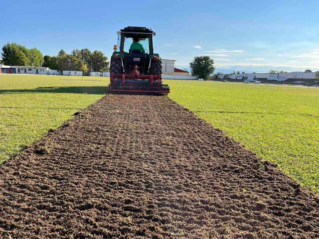 Έτσι, μετά τις εργασίες στα ποδοσφαιρικά γήπεδα Δένδρων και Πλατανουλίων, τα οποία πλέον συγκαταλέγονται στα καλύτερα του Νομού, ξεκίνησαν άμεσα οι εργασίες επανασποράς στο Δημοτικό Γήπεδο Τυρνάβου.