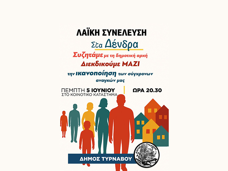 Ο Δήμος Τυρνάβου συνεχίζει τις λαϊκές συνελεύσεις στα χωριά του Δήμου, με στόχο την άμεση επαφή με τους κατοίκους, την καταγραφή των αναγκών και τον κοινό αγώνα για την ικανοποίησή τους.