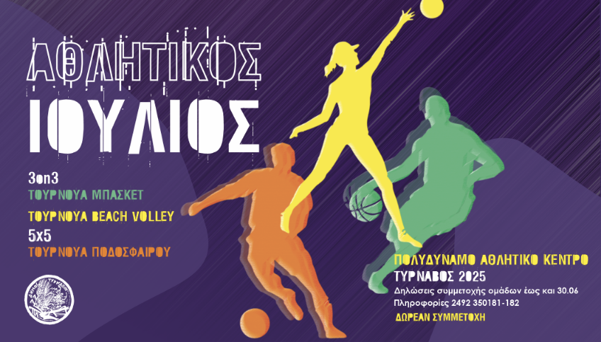 Ο Δήμος Τυρνάβου επενδύει σταθερά σε δράσεις που ενισχύουν τη μαζική άθληση, ιδιαίτερα στη νεολαία, και προάγουν το ομαδικό πνεύμα και την κοινωνική συνοχή. Σας περιμένουμε όλους να συμμετέχετε ενεργά, είτε ως αθλητές είτε ως θεατές, σ’ έναν μήνα γεμάτο κίνηση, ζωντάνια και αθλητικό πνεύμα.