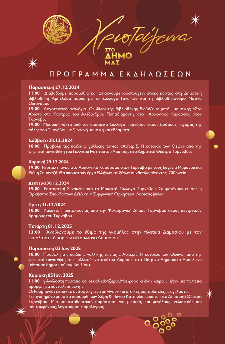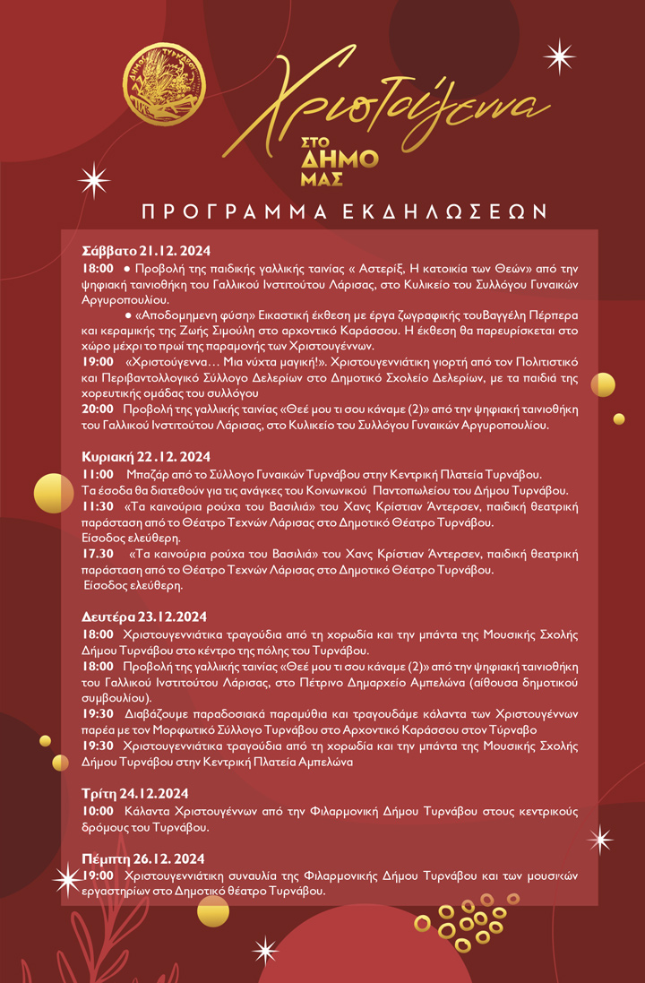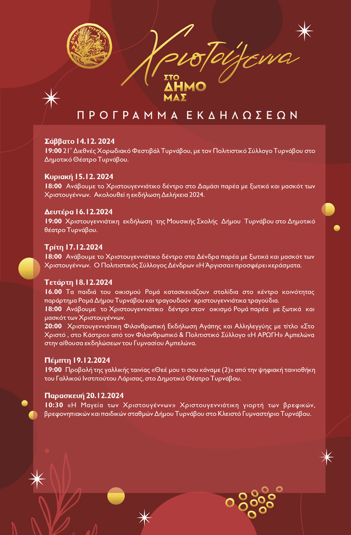 Ο Δήμος Τυρνάβου, σας προσκαλεί να συμμετάσχετε σε μια σειρά από μοναδικές εκδηλώσεις που υπόσχονται να γεμίσουν χαρά, ζεστασιά και λάμψη τις μέρες των εορτών.