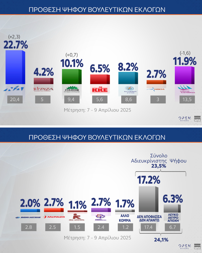 35-44 ετών: ΝΔ 22,4%, Πλεύση 14,5%, ΠΑΣΟΚ 7%