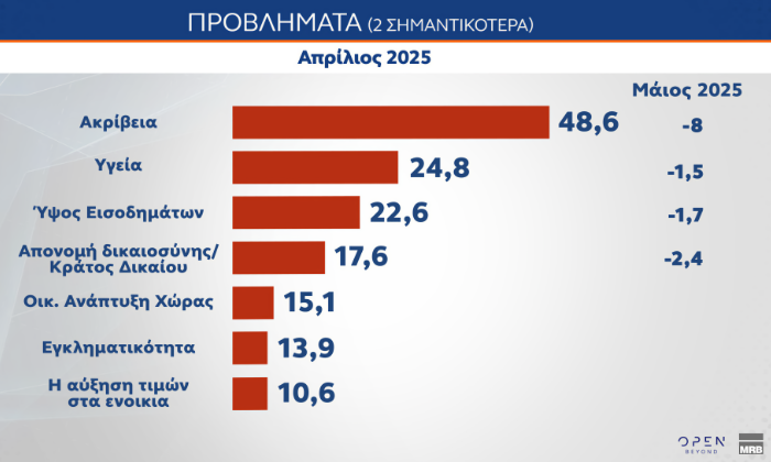 Όσο για τα αισθήματα των πολιτών κυριαρχεί η οργή με 44,3%, ακολουθεί η απογοήτευση με 43,8% και στη συνέχεια έρχεται ο φόβος με 34%, η ελπίδα με 27%, η περηφάνια με 12% και η σιγουριά με 9,4%.