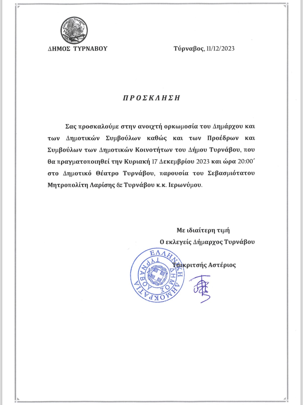 Σύμφωνα με την ανακοίνωση – πρόσκληση του νέου Δημάρχου Στέλιου Τσικριτσή, στο Δημοτικό Θέατρο Τυρνάβου θα πραγματοποιηθεί η ορκωμοσία του όπως και των Προέδρων και Συμβούλων, ενώ το παρόν θα δώσει και ο Μητροπολίτης Λαρίσης και Τυρνάβου.