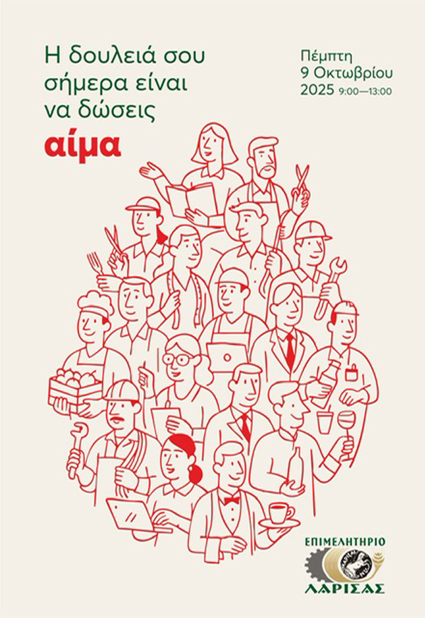 Από το Επιμελητήριο Λάρισας ανακοινώνεται ότι η Διοίκηση του Φορέα μας σε συνεργασία με τη μονάδα αιμοδοσίας του Γενικού Νοσοκομείου Λάρισας και το ΕΚΕΑ (Εθνικό Κέντρο Αιμοδοσίας)  διοργανώνει στις 9/10/2025 ημέρα Πέμπτη και ώρα 9:00-13:00 εθελοντική αιμοδοσία στο ισόγειο του Επιμελητηρίου.