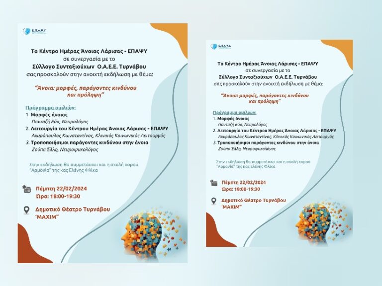 Ευχαριστούμε θερμά τα στελέχη του Κέντρου Ημέρας Άνοιας Λάρισας – ΕΠΑΨΥ για την διαθεσιμότητα τους και την άψογη συνεργασία καθώς επίσης και τα μέλη του ΚΑΠΗ Αμπελώνα για την συμμετοχή και τις ιδέες τους.