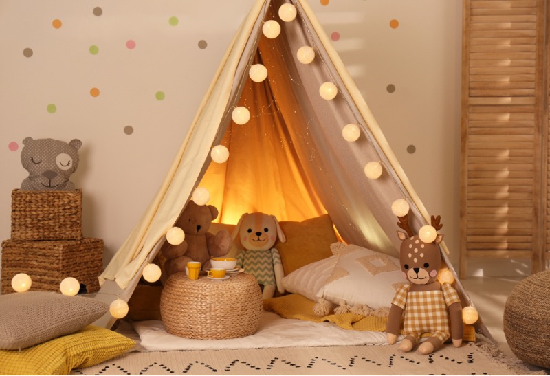 Ο φωτισμός παίζει εξίσου σημαντικό ρόλο στην διάθεση και την συμπεριφορά του παιδιού. Προτιμήστε το φυσικό φως όσο υπάρχει η δυνατότητα και για τα φωτιστικά επιλέξτε θερμό φως διότι θα δημιουργηθεί ένα χαλαρωτικό περιβάλλον. Βάλτε φως γιρλάντες σε διάφορα σχέδια όπως αστεράκια περιμετρικά του κρεβατιού ή πάνω στα ράφια. Τέλος, μπορείτε να δημιουργήσετε μόνοι σας ένα φωτιστικό από ένα βάζο ή από μια μεγάλη στρογγυλή λάμπα που δεν δουλεύει πλέον.