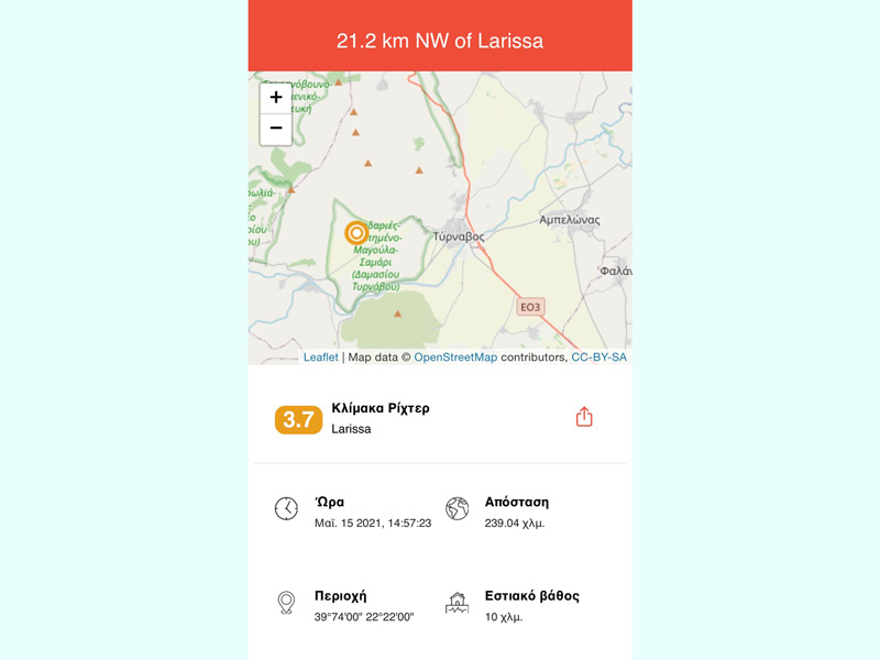Ισχυρή δόνηση μετά από πολλές μέρες ξύπνησε μνήμες άσχημες.3.7 πολύ έντονος με διάρκεια πολύ αισθητός. Ο σεισμός έγινε ανάμεσα σε Τύρναβο και Δαμάσι με εστιακό βάθος ευτυχώς τα 10 χιλιόμετρα στις 14:57 σήμερα το μεσημέρι.
