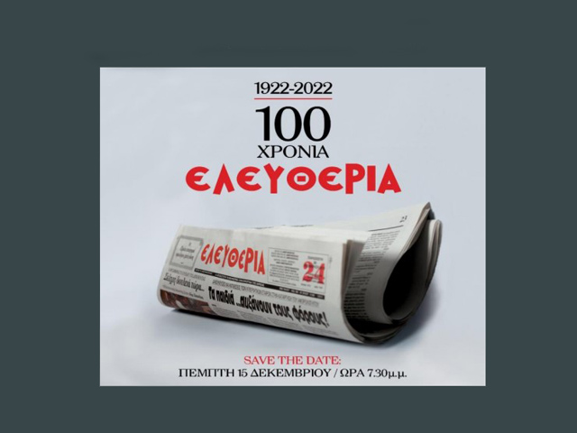 Με αφορμή τη συμπλήρωση 100 χρόνων κυκλοφορίας, ο Δημοσιογραφικός Οργανισμός «Ελευθερία» σας προσκαλεί σε μια μεγάλη ιστορική γιορτή.