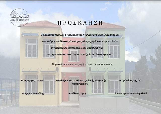 Εγκαίνια παράλληλα και Αγιασμός θα πραγματοποιηθούν την Πέμπτη 28 Σεπτεμβρίου 2023 και ώρα 09:30π.μ. στο Μακρυχώρι, για τη νέα σχολική μονάδα του νεόδμητου Δημοτικού Σχολείου Μακρυχωρίου.