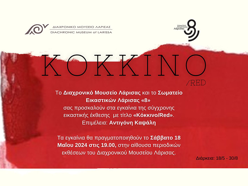 Το Διαχρονικό Μουσείο Λάρισας και το Σωματείο Εικαστικών Λάρισας «8» παρουσιάζουν την έκθεση σύγχρονης τέχνης με τίτλο «Κόκκινο / Red», σε επιμέλεια της ιστορικού τέχνης, εικαστικού και ανεξάρτητης επιμελήτριας Αντιγόνης Καψάλη.