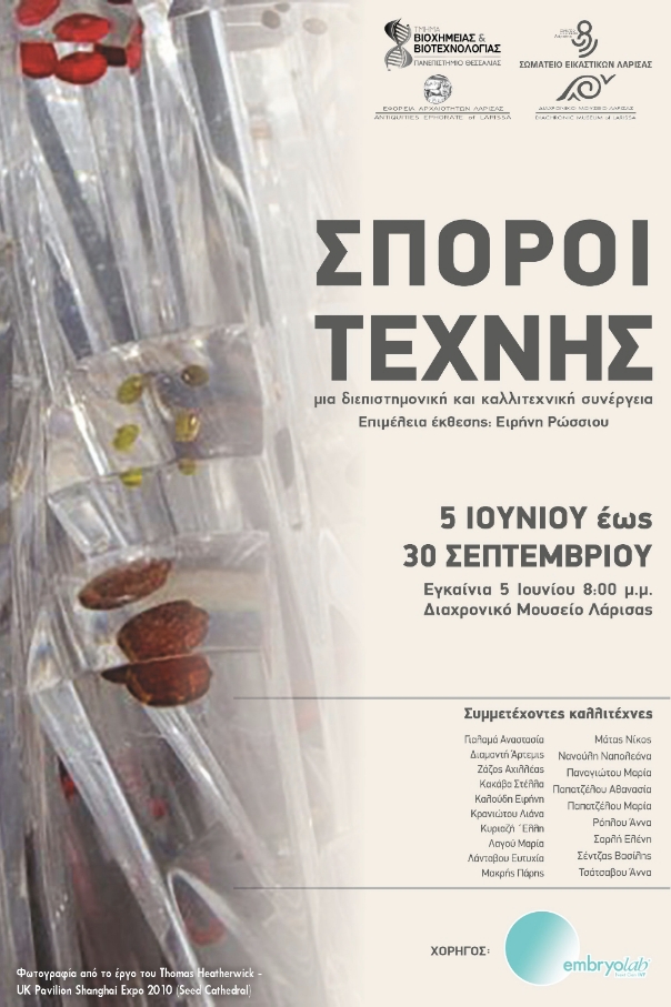 Στο πλαίσιο των εορταστικών εκδηλώσεων για τα 25 χρόνια από την ίδρυση και λειτουργία του Τμήματος Βιοχημείας και Βιοτεχνολογίας του Πανεπιστημίου Θεσσαλίας, το Διαχρονικό Μουσείο Λάρισας φιλοξενεί στην αίθουσα περιοδικών εκθέσεων την ομαδική εικαστική έκθεση του Σωματείου Εικαστικών Καλλιτεχνών Λάρισας «8» με τίτλο «Σπόροι Τέχνης», σε επιμέλεια της Αρχαιολόγου-Ιστορικού Τέχνης Ειρήνης Ρώσσιου.