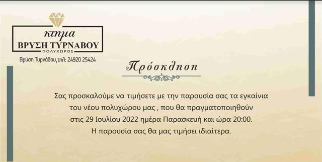 Το κτήμα Βρύση σας προσκαλεί να τους τιμήσετε με την παρουσία σας στα εγκαίνια του νέου πολυχώρου την Παρασκευή 29 Ιουλίου 2022 και ώρα 20:00.