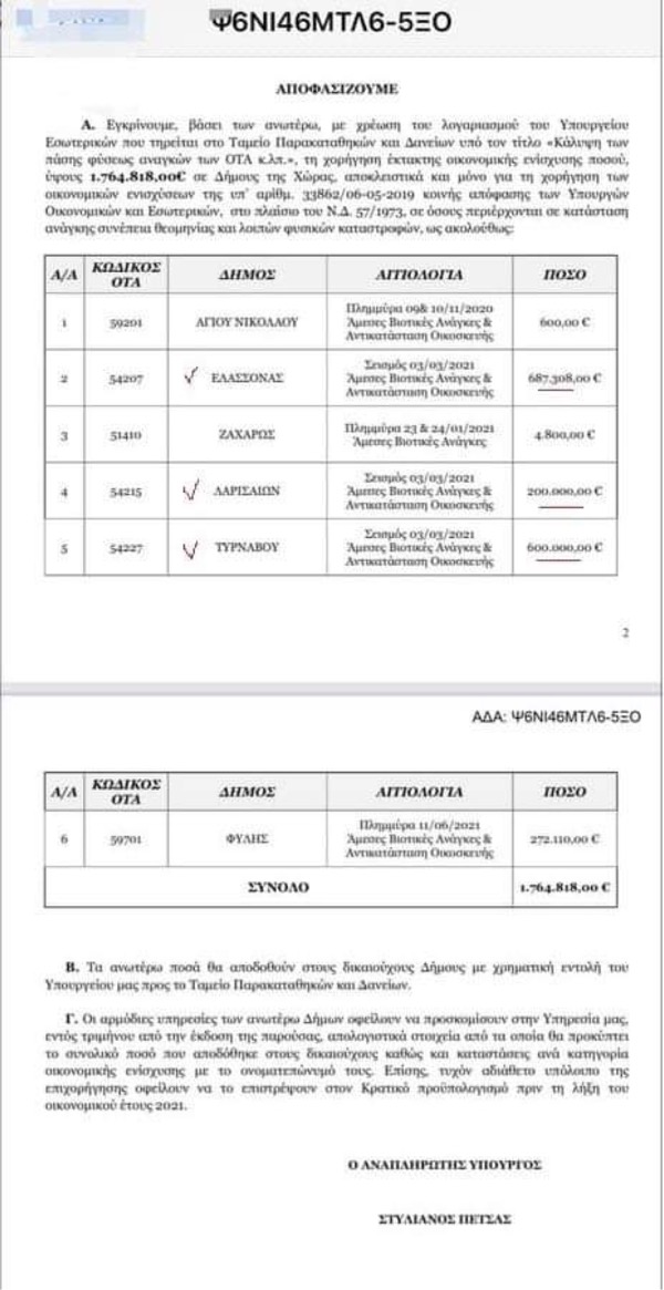 Ο αναπληρωτής υπουργός Εσωτερικών Στέλιος Πέτσας υπέγραψε την πολυαναμενόμενη απόφαση επιχορήγησης των σεισμόπληκτων Δήμων. Ανάμεσά τους και ο Δήμος Τυρνάβου που θα εισπράξει το ποσο των 600 χιλιάδων ευρώ για να συνεχίσει την πληρωμή των αποζημιώσεων οικοσκευής και να καλύψει κι άλλες σοβαρές ανάγκες στον τομέα της αποκατάστασης των ζημιών που προκάλεσε ο σεισμός.