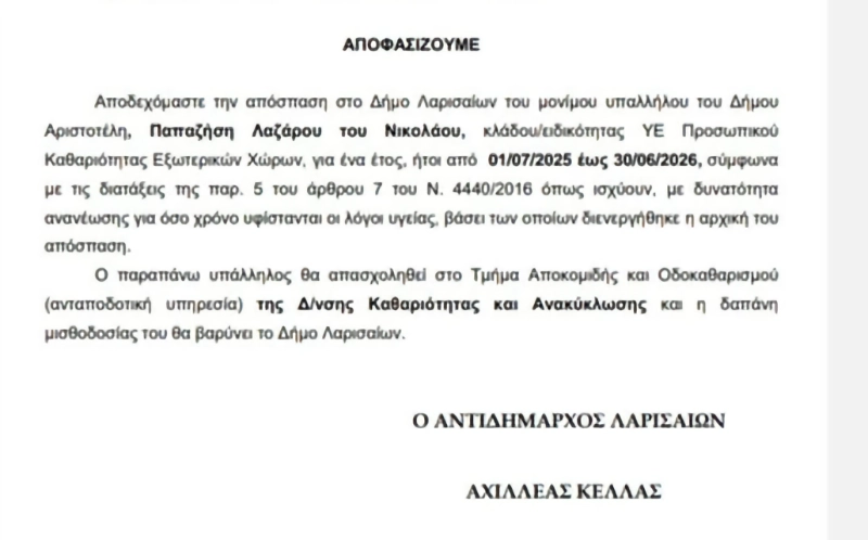 Με απόφαση του Αντιδημάρχου Λαρισαίων Αχιλλέα Κέλλα εγκρίθηκε η απόσπαση του Λάζαρου Παπαζήση του Νικολάου, υπαλλήλου του Δήμου Αριστοτέλη Χαλκιδικής, στον Δήμο Λαρισαίων για το χρονικό διάστημα από 1 Ιουλίου 2025 έως 30 Ιουνίου 2026.