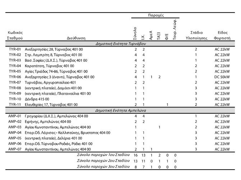 3. Το τρίτο στάδιο, δηλαδή οι υπόλοιπες 8 παροχές, αφορούν κυρίως συµπληρωµατικούς σταθµούς συγκεκριµένα από µία παροχή στο ∆αµάσι, στα Πλατανούλια, στα ∆ένδρα, στον Βρυότοπο, στα ∆ελέρια και στη Ροδιά. Τέλος τοποθετείται και ένας επιπλέον φορτιστής για ΙΧ και ΑµεΑ στον Αµπελώνα.