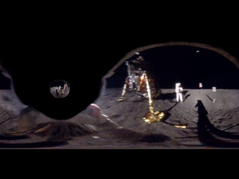 Στην αντανάκλαση του κράνους του Aldrin φαίνονται αρκετές πληροφορίες για το background του Armstrong και τώρα ο ειδικός οπτικών εφέ Michael Ranger, δημοσίευσε στο Reddit τη μεταφορά των αντανακλάσεων στην προσωπίδα του Aldrin, σε μία σφαιρική εικόνα για να μπορούμε να δούμε όλοι μας τι ακριβώς έβλεπε εκείνη τη στιγμή ο Aldrin.