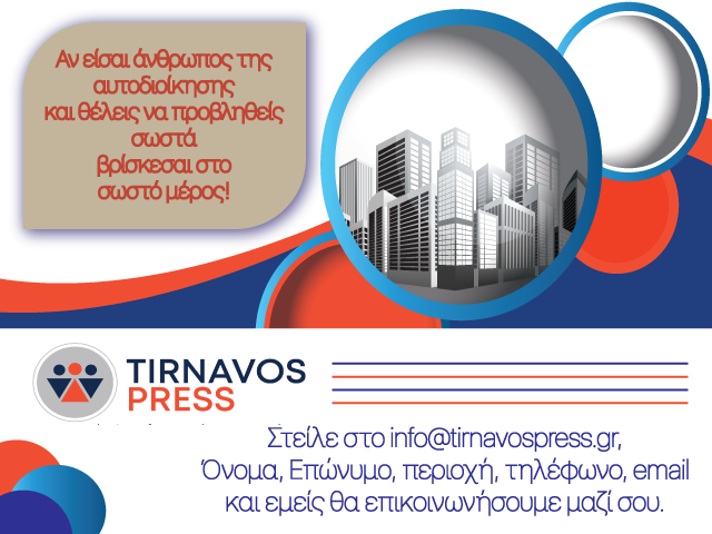 Στείλε στο info@tirnavospress.gr, Όνομα, Επώνυμο, περιοχή, τηλέφωνο, email και εμείς θα επικοινωνήσουμε μαζί σου.